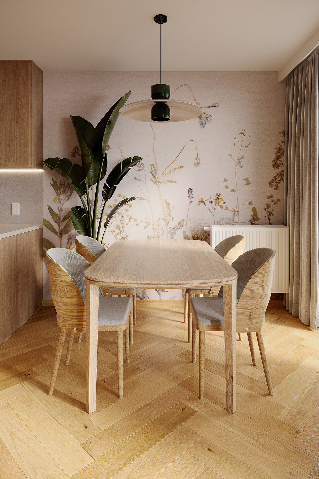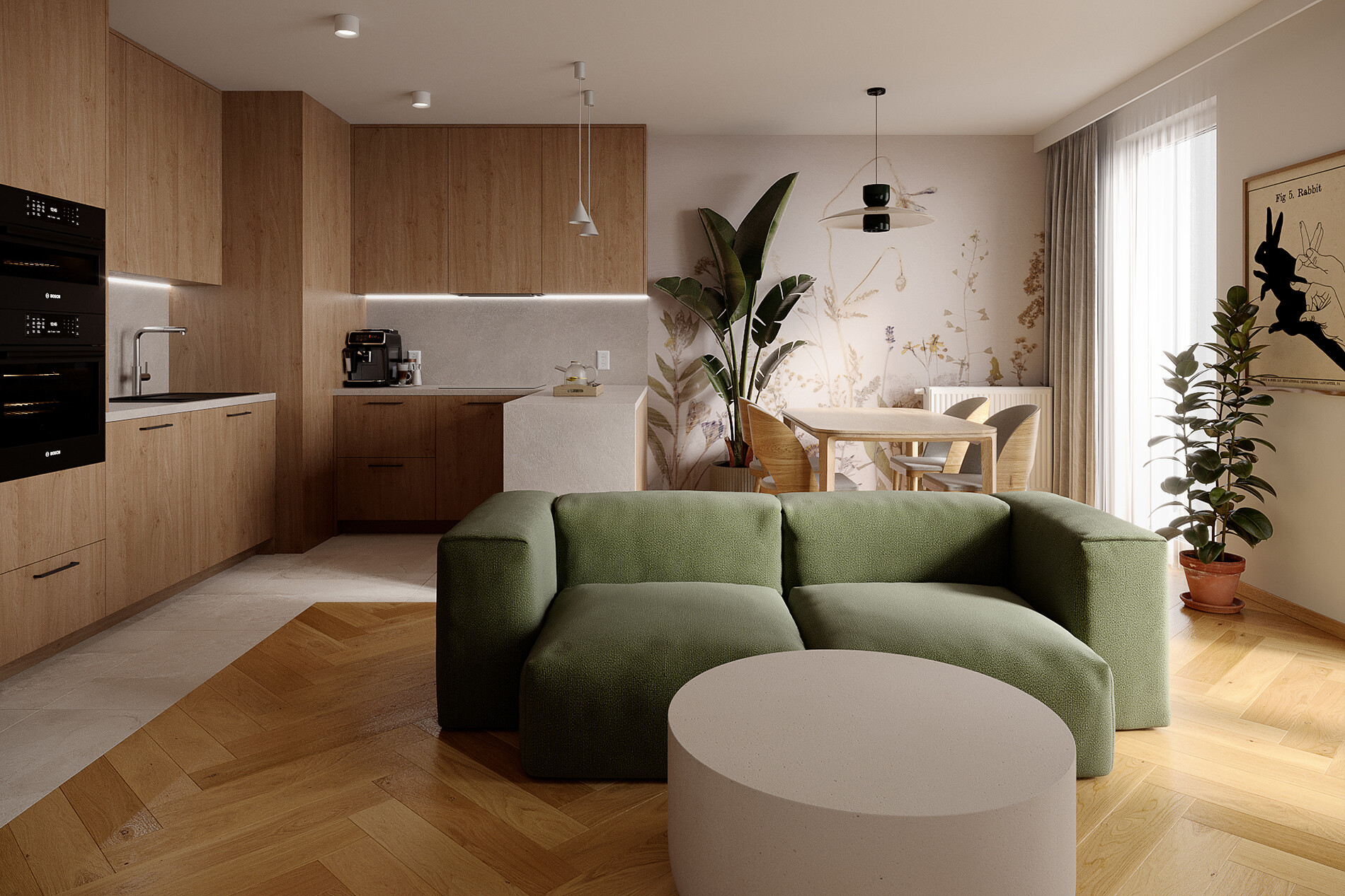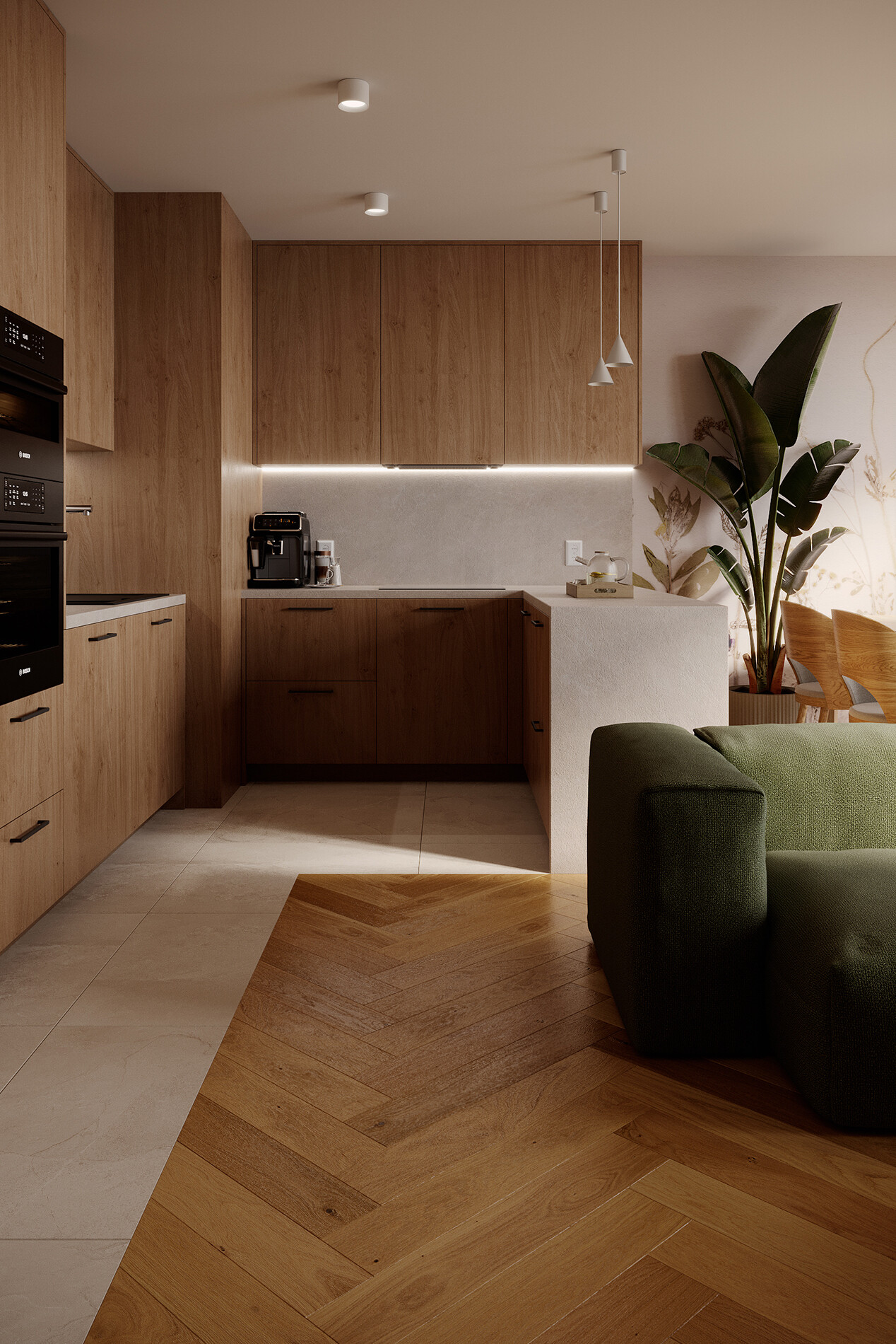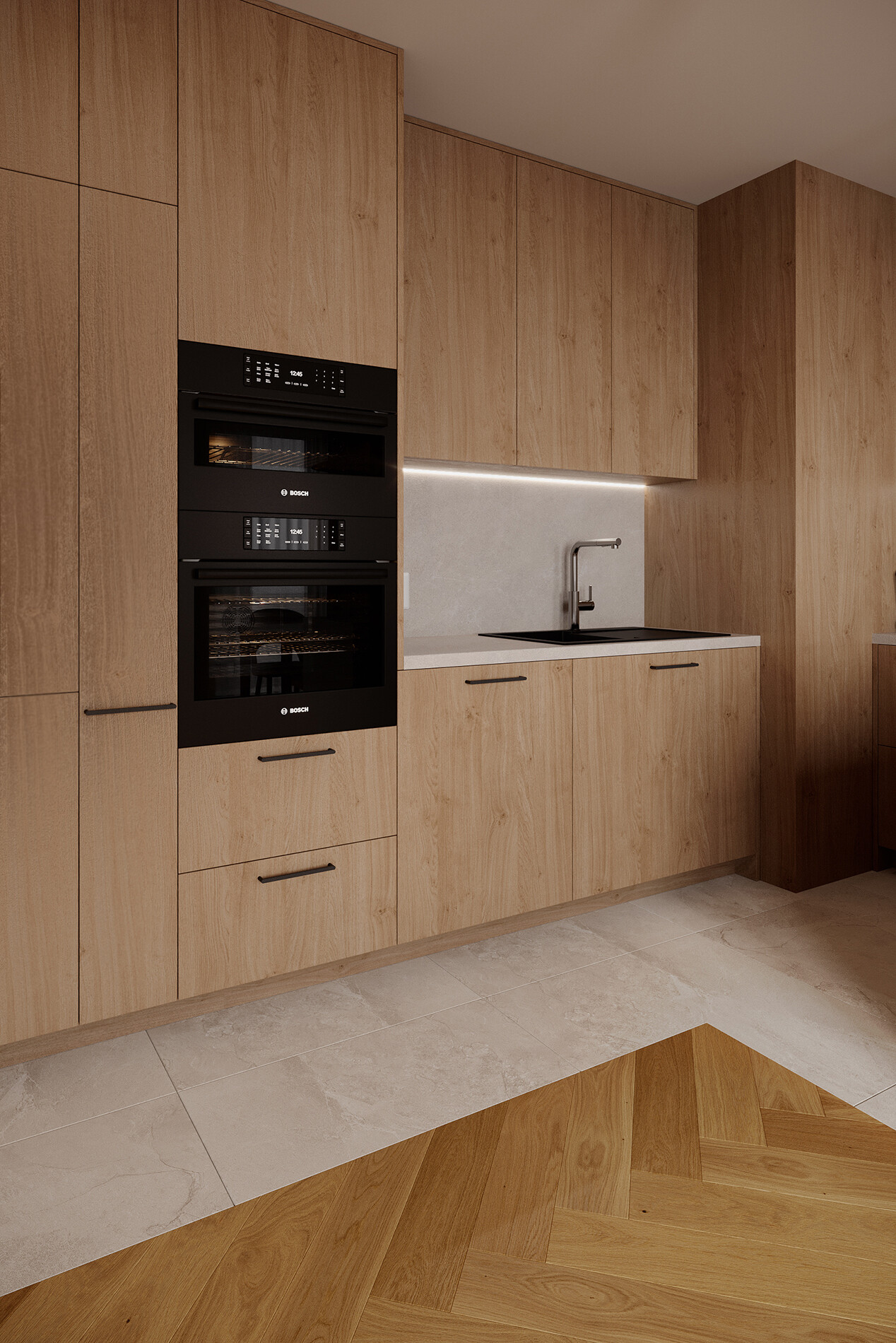 Kuchnia została zaprojektowana jako zabudowa na pełną wysokość pomieszczenia, wykonana na bazie płyty laminowanej Egger H3170 ST12 Dąb Kendal Naturalny. Blaty oraz panel między szafkami wykonano z laminatu Swiss Krono D30220 Kwarcyt Szary,