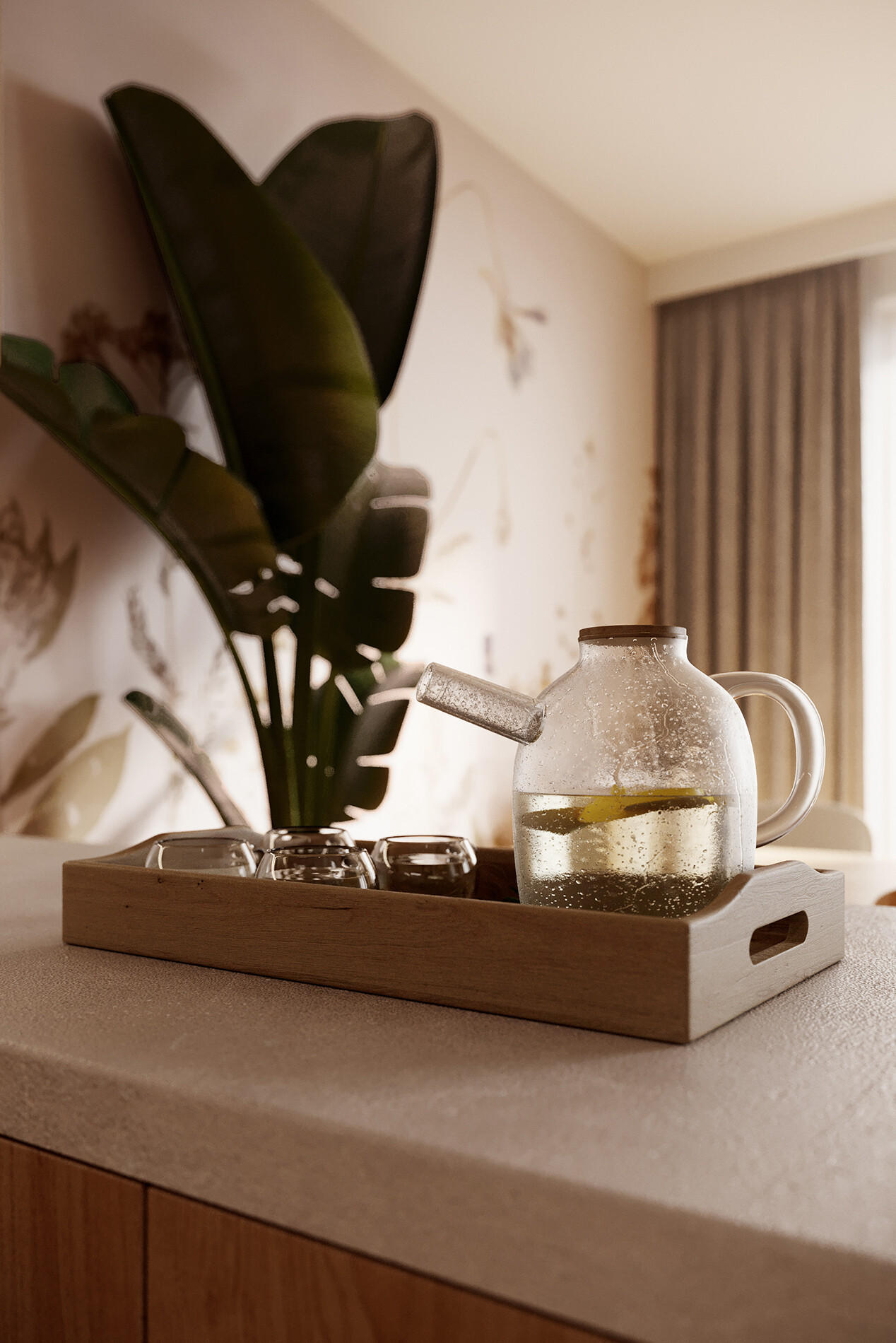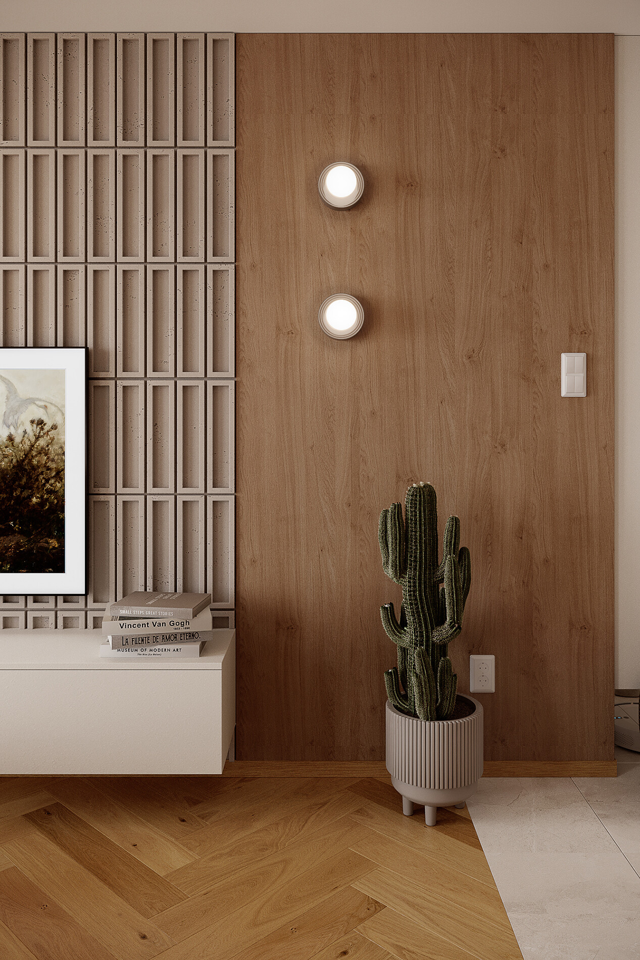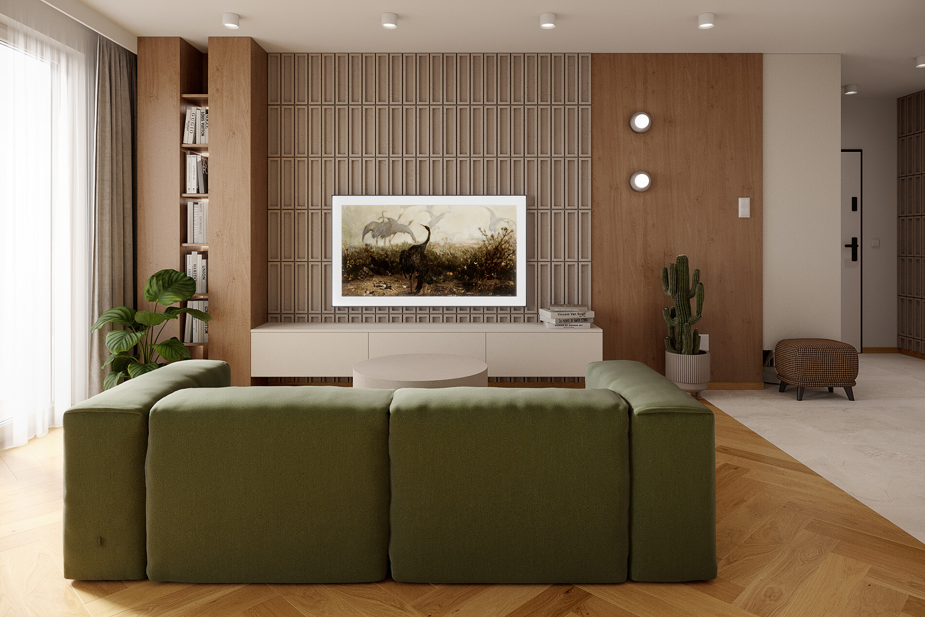 Ściana telewizyjna została zaprojektowana jako zabudowa meblowa o głębokości 400 mm, wykonana z tej samej płyty laminowanej Egger co kuchnia, co pozwoliło zachować ciągłość materiałową. Zabudowa zawiera szafki z systemem TIP-ON oraz miejsce na sprzęt RTV. Elementem wyróżniającym jest panel dekoracyjny 3D VT-PB51 CL04 w odcieniu kaszmirowego beżu, zastosowany jako tło dla strefy medialnej.