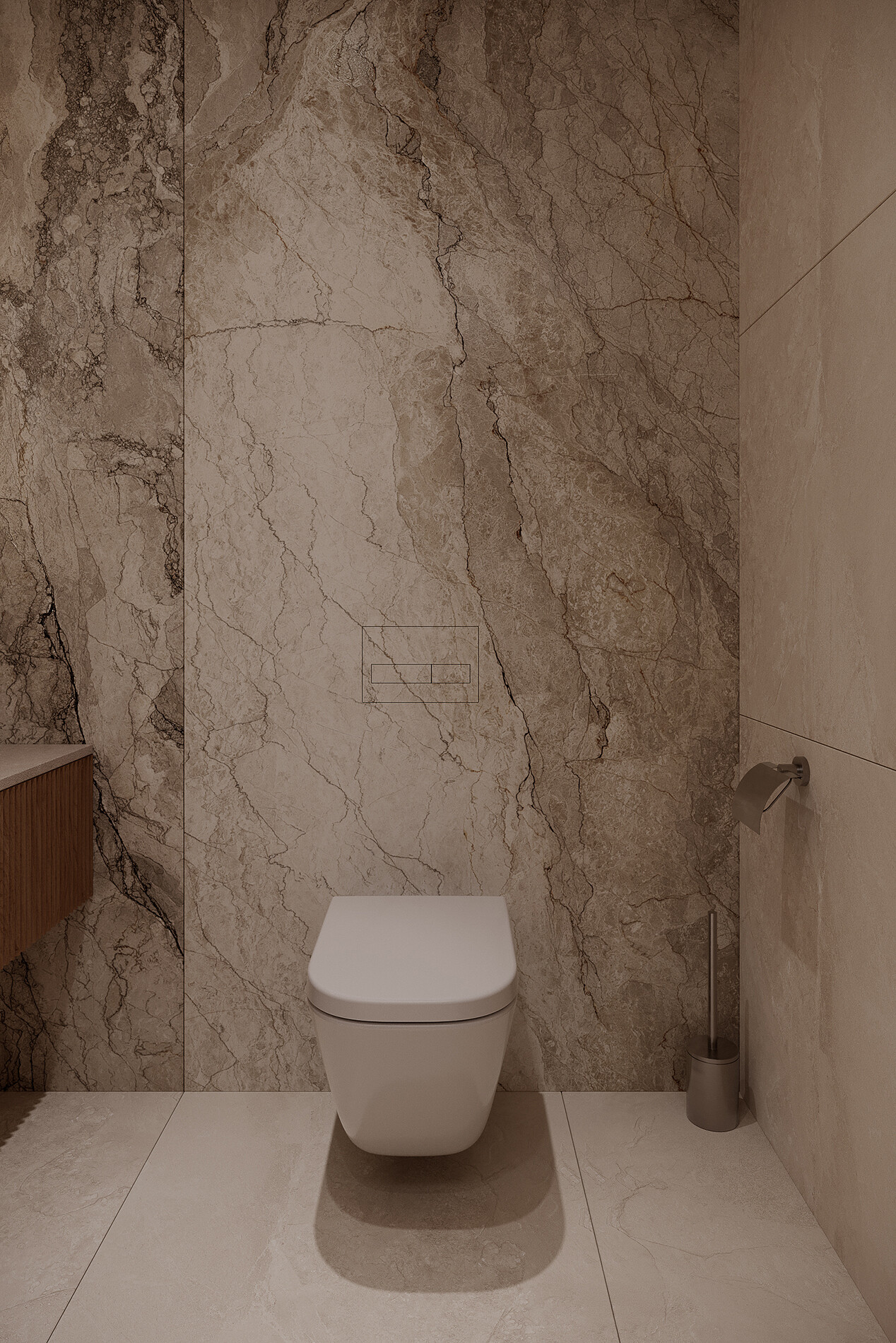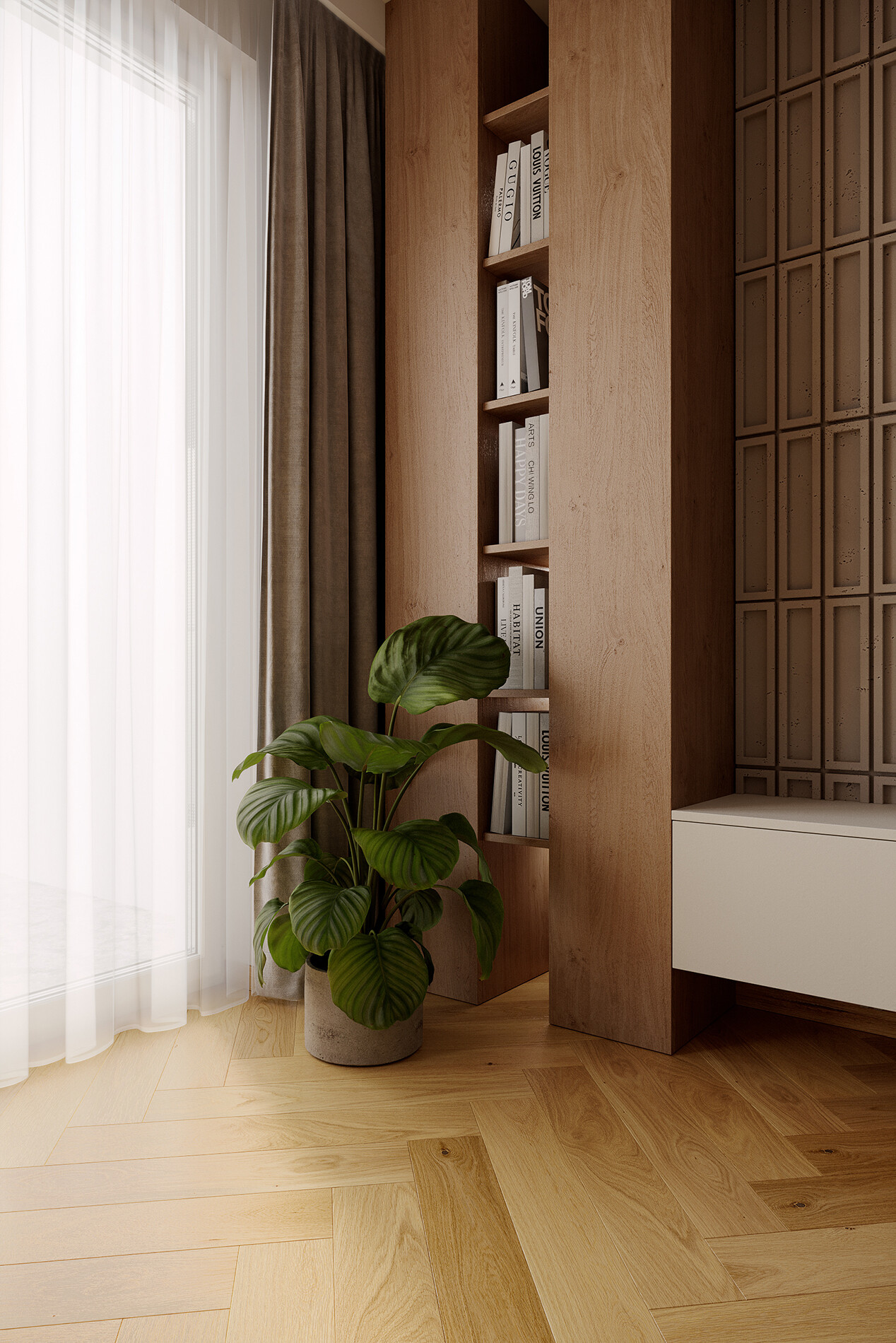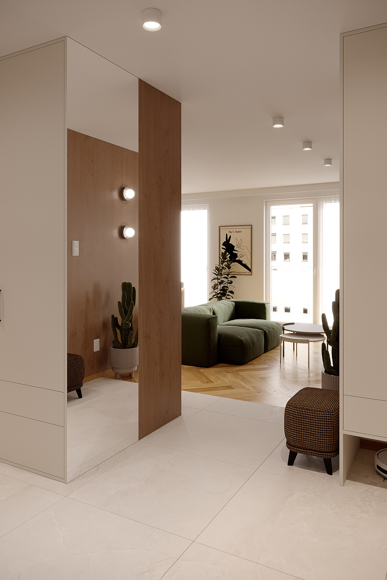 W całym mieszkaniu zastosowano deskę warstwową ułożoną w jodełkę klasyczną – dąb Bright Classico Line marki Barlinek, uzupełnioną o listwy przypodłogowe w wykończeniu dębowym lakierowanym matowo. W strefach komunikacyjnych i łazience zaprojektowano wielkoformatowy gres Grand Cave Ivory STR o wymiarach 79,8 × 79,8 cm, co pozwoliło ograniczyć ilość fug i uprościć odbiór przestrzeni.