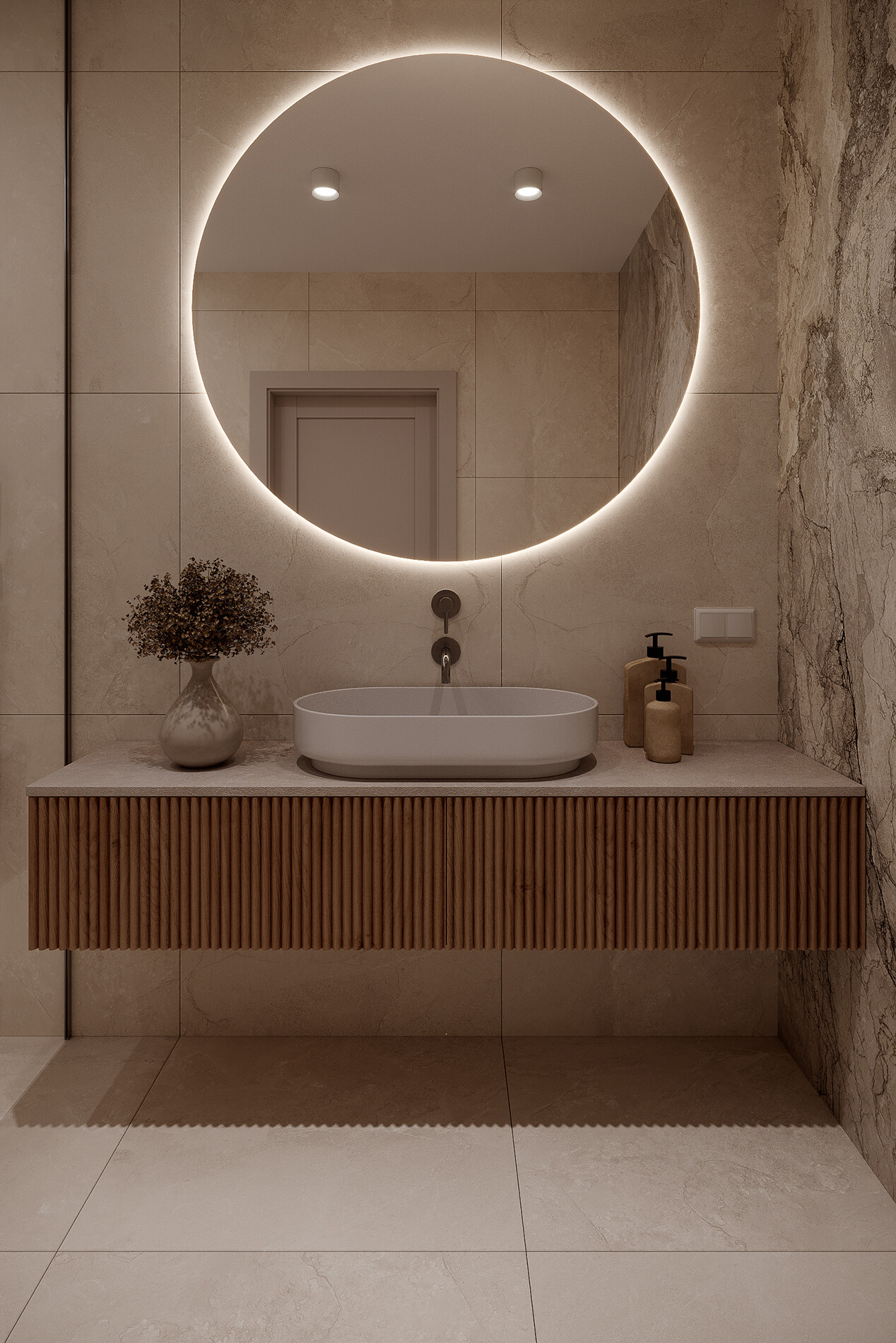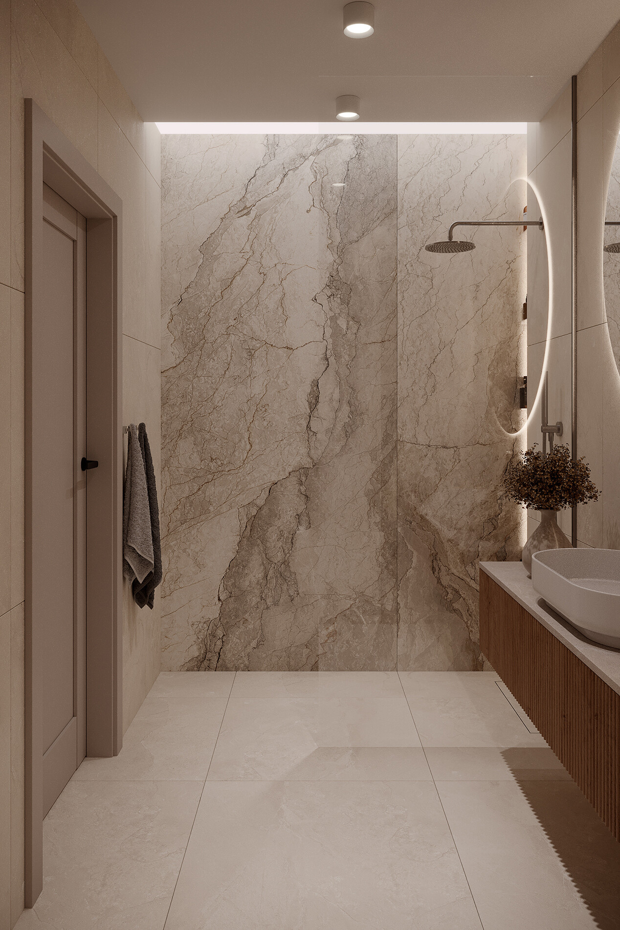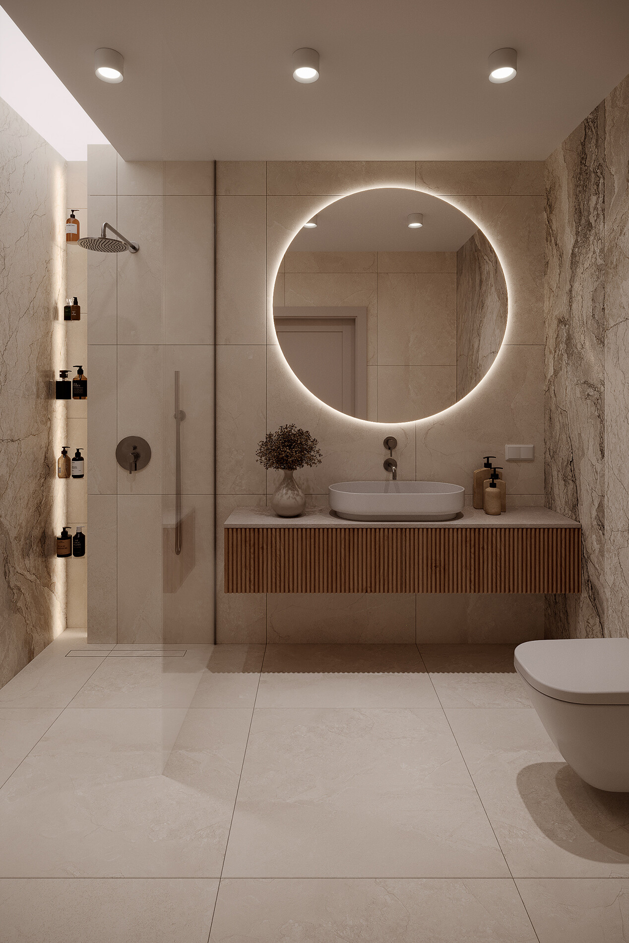 Łazienka została zaprojektowana z prysznicem typu walk-in. Armatura prysznicowa i umywalkowa pochodzi z serii Omnires Y w wykończeniu nikiel szczotkowany. Lustro okrągłe z podświetleniem LED. Zestaw WC oparto na stelażu Geberit Duofix z miską Geberit iCon.