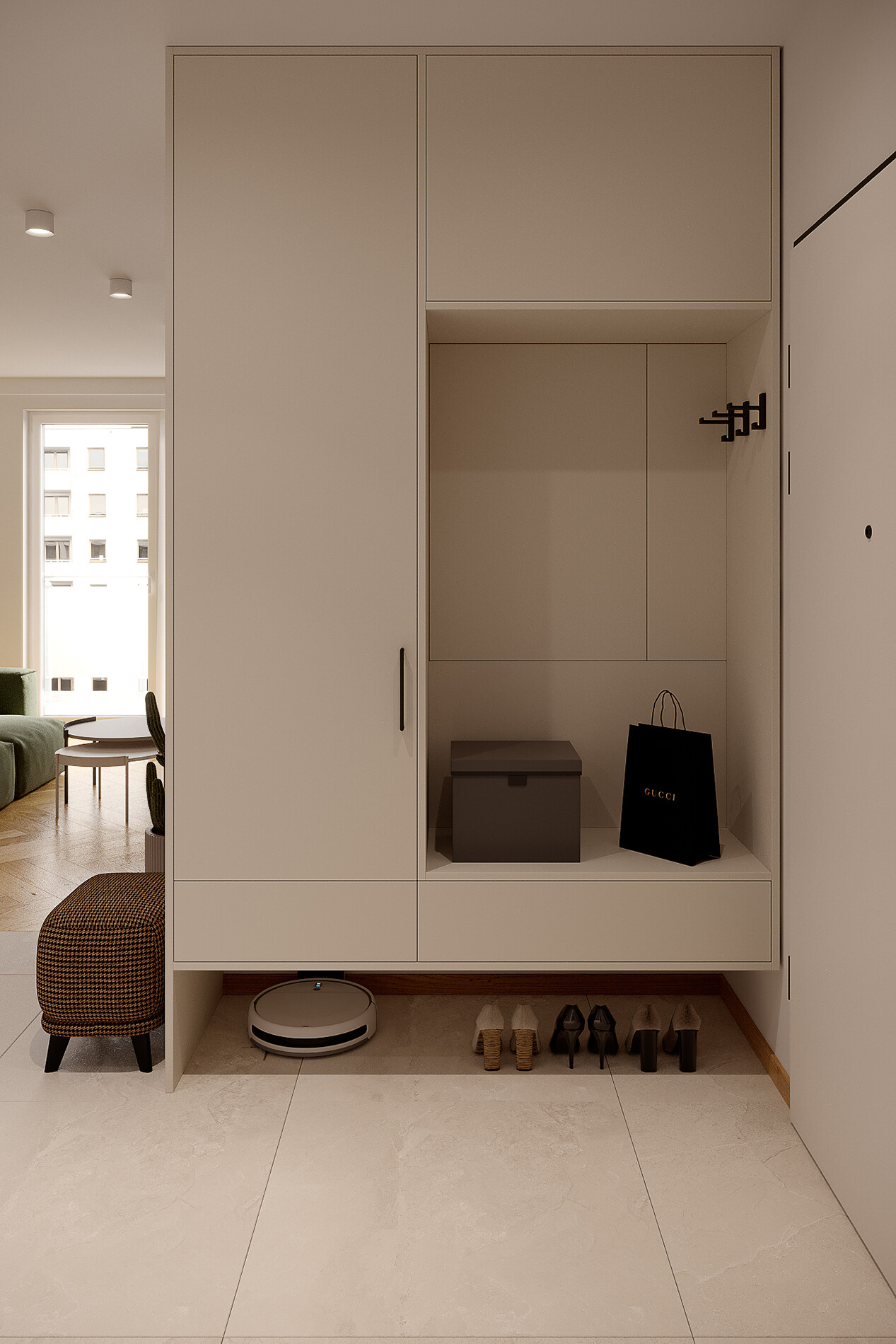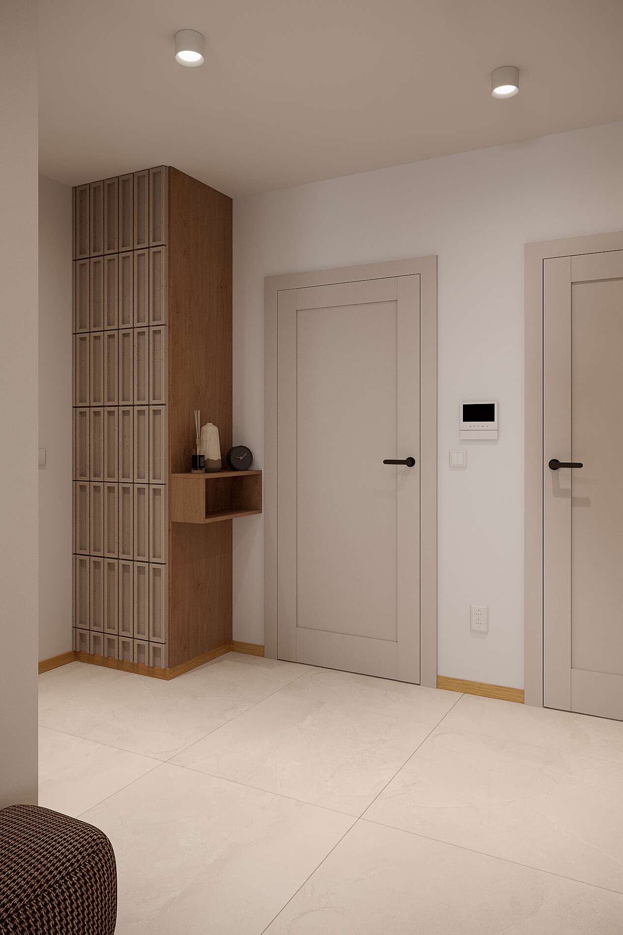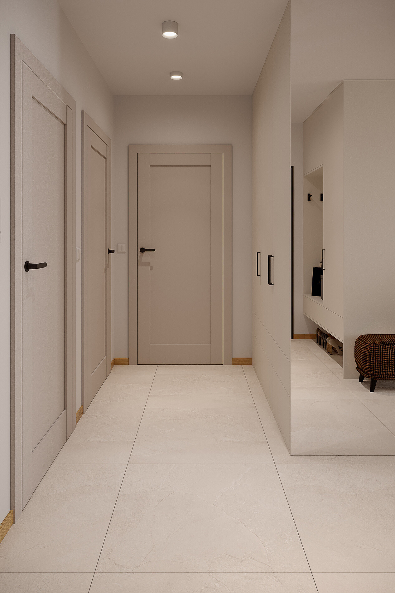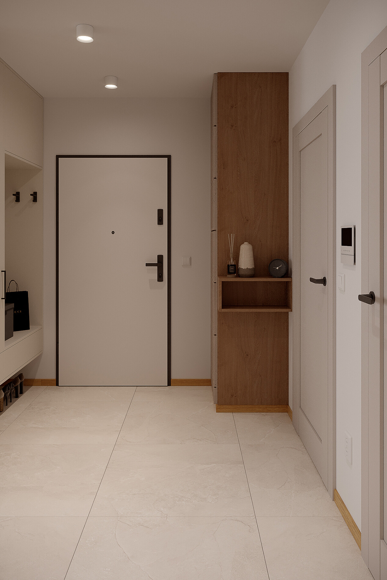 W przedpokoju zaprojektowano dwie zabudowy stolarskie o głębokości 600 mm, z miejscem na odzież, szufladami oraz lustrem zlicowanym z płaszczyzną mebli. Fronty wykonano z płyty Egger U775 ST9 Szary Biały, z uchwytami GTV w wykończeniu czarny mat. Jedna z zabudów została zaprojektowana z uwzględnieniem liczników oraz strefy technicznej, co pozwoliło zachować estetykę przestrzeni wejściowej