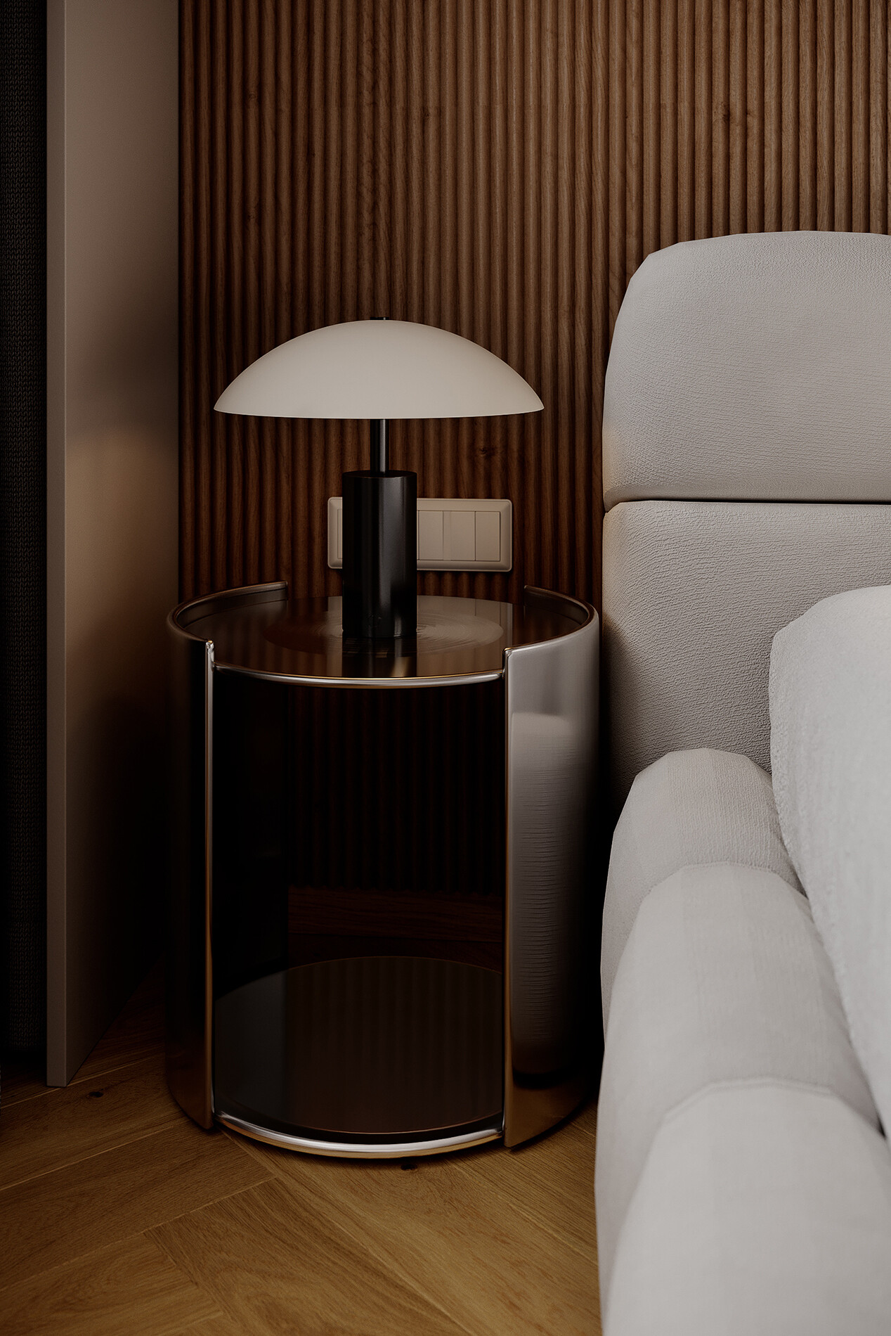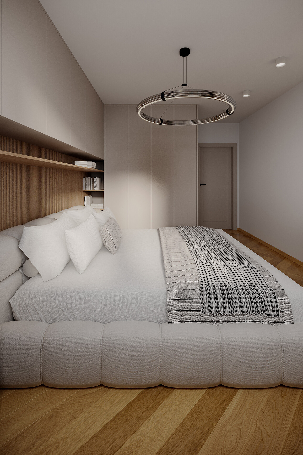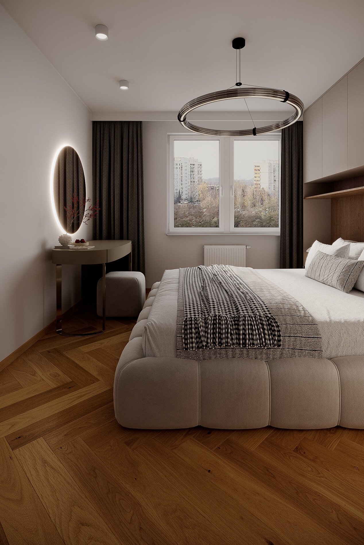 W sypialni zaprojektowano zabudowę ściany za łóżkiem. Konstrukcja wykonana została z płyty Egger U702 ST9 Kaszmir. Szafy zaprojektowano do pełnej wysokości z systemem TIP-ON.